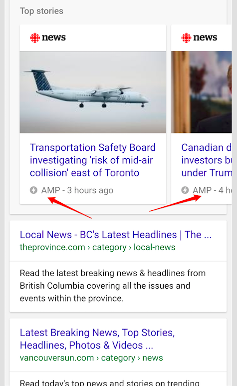 If you search on Google from your mobile phone, you’ll see that some pages listed in the search results have AMP listed beside them. For other searches (like news stories), the results all appear in a carousel above the organic results.